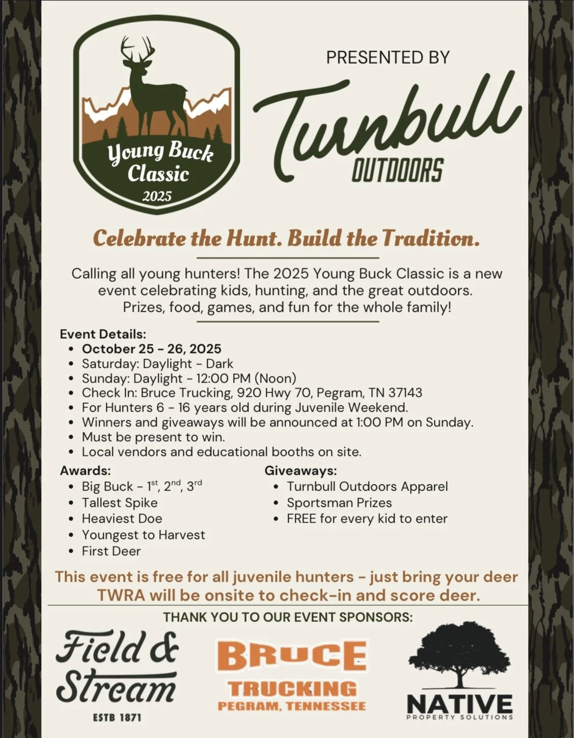 Join us October 25–26, 2025 for the first-ever Young Buck Classic, presented by Turnbull Outdoors! This free youth hunting event celebrates kids, the outdoors, and the tradition of deer hunting in Tennessee. Open to hunters ages 6–16 during Juvenile Weekend, the Classic features exciting awards, giveaways, local vendors, and educational booths—all capped off with family fun, food, and prizes. Bring your deer to be scored, check in with TWRA, and be part of building a tradition that will last for generations.